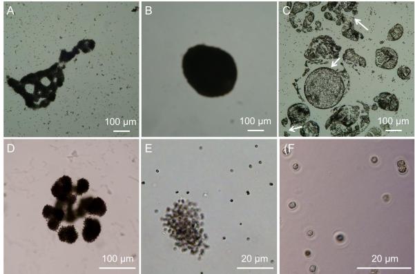 Image: Commonly found Microcystis morphospecies in the field: A. M. aeruginosa (Kützing) Kützing; B. M. ichthyoblabe Kützing; C. M. wesenbergii (Komárek) Komárek; D. M. novacekii (Komárek) Compére; E. unidentified colony from field samples taken in early spring in Lake Taihu, China; F. single cells from Lake Taihu, China.