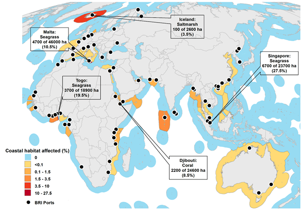 We estimated that ports associated with the Belt and Road Initiative could impact approximately 55,000 hectares of seagrass, 8,500 hectares or coral, 4,000 hectares of mangroves and 2,000 hectares of saltmarsh.