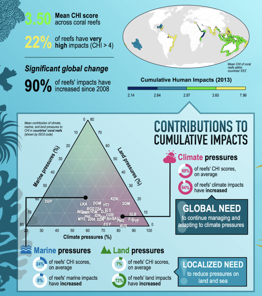 We found that climate contributed the most to human pressures across all 50 reefs and that there is still a continued need to manage and adapt to climate pressures. This is especially true because there is so much uncertainty about how climate change interacts with other pressures. Although the 50 reefs are termed as being less exposed to climate impacts, our findings highlight that coral reef climate refugia shouldn’t be mistaken to have climate immunity. It is still really important to focus on climate efforts in these areas.